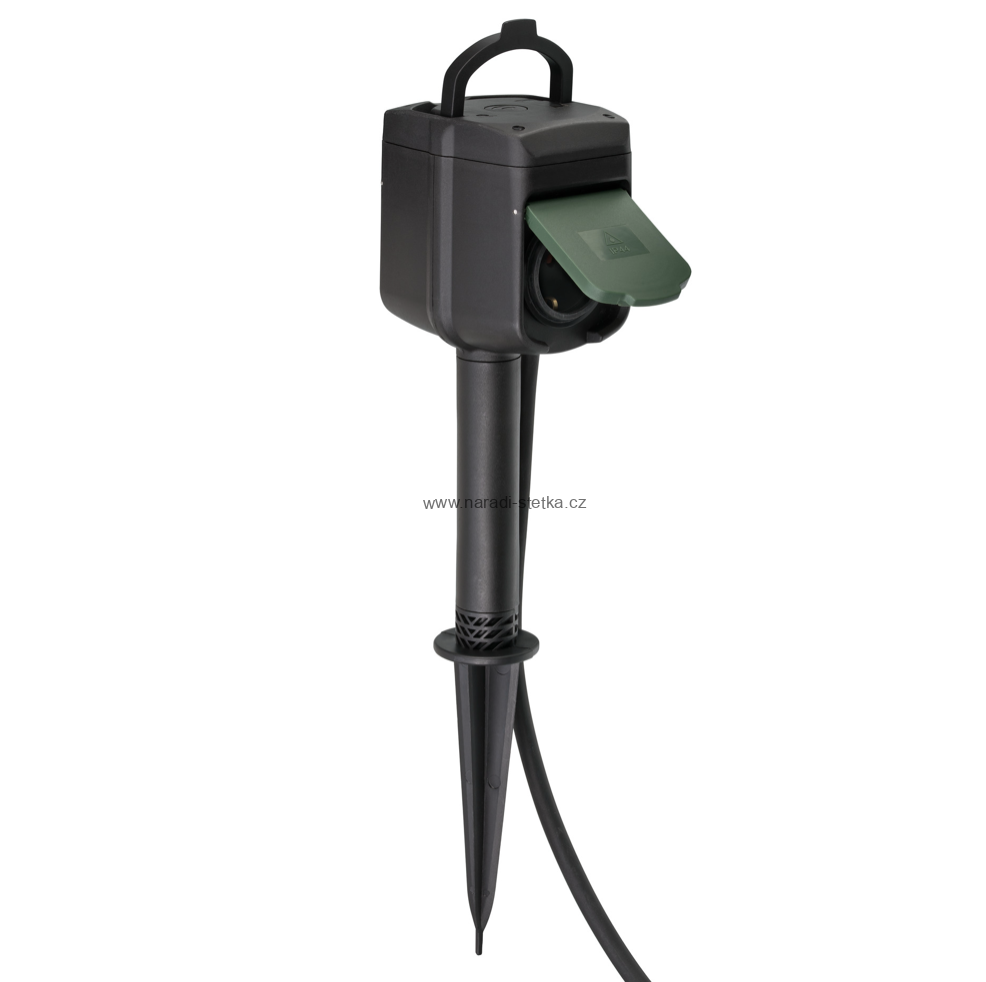 - Robustní zahradní zásuvka se zemnicím trnem pro pevné ukotvení v zemi a krytem z robustního plastu odolného proti povětrnostním vlivům a neoprenovým přívodním kabelem s uzemňovací kontaktní zástrčkou