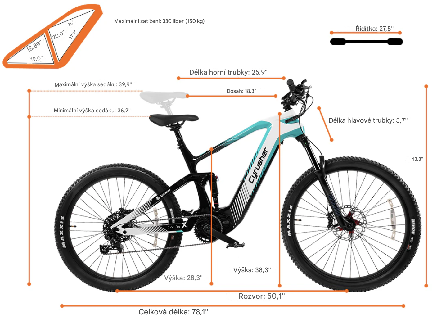 Délka horní trubky | 25,9"/66 cm |