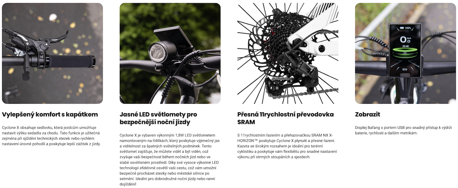Počínaje čtyřpístkovými brzdami SRAM G2 R až po nastavitelnou kapačku, Cyclone X je vybaven funkcemi, které upřednostňují vaše pohodlí a bezpečnost při každé jízdě. Zdolávejte drsné cesty s jistotou a kontrolou.