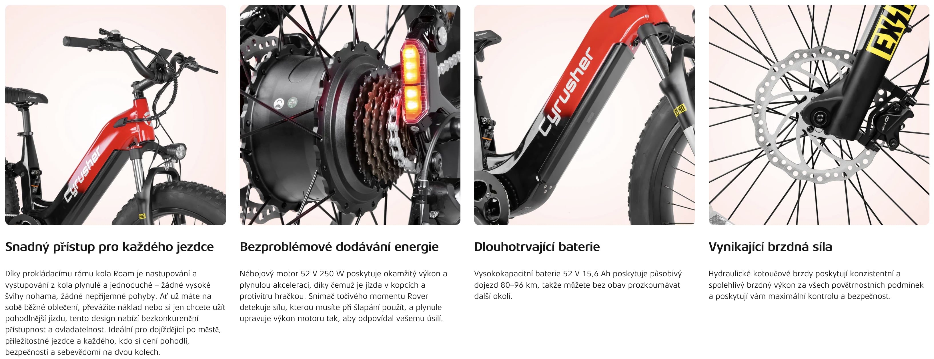 Díky výkonnému 250W nábojovému motoru (750W), pokročilému senzoru točivého momentu, hydraulickému odpružení a baterii s vysokou kapacitou 52V / 15,6Ah je model Roam Step-Thru navržen tak, aby s lehkostí zdolal jakýkoli terén.