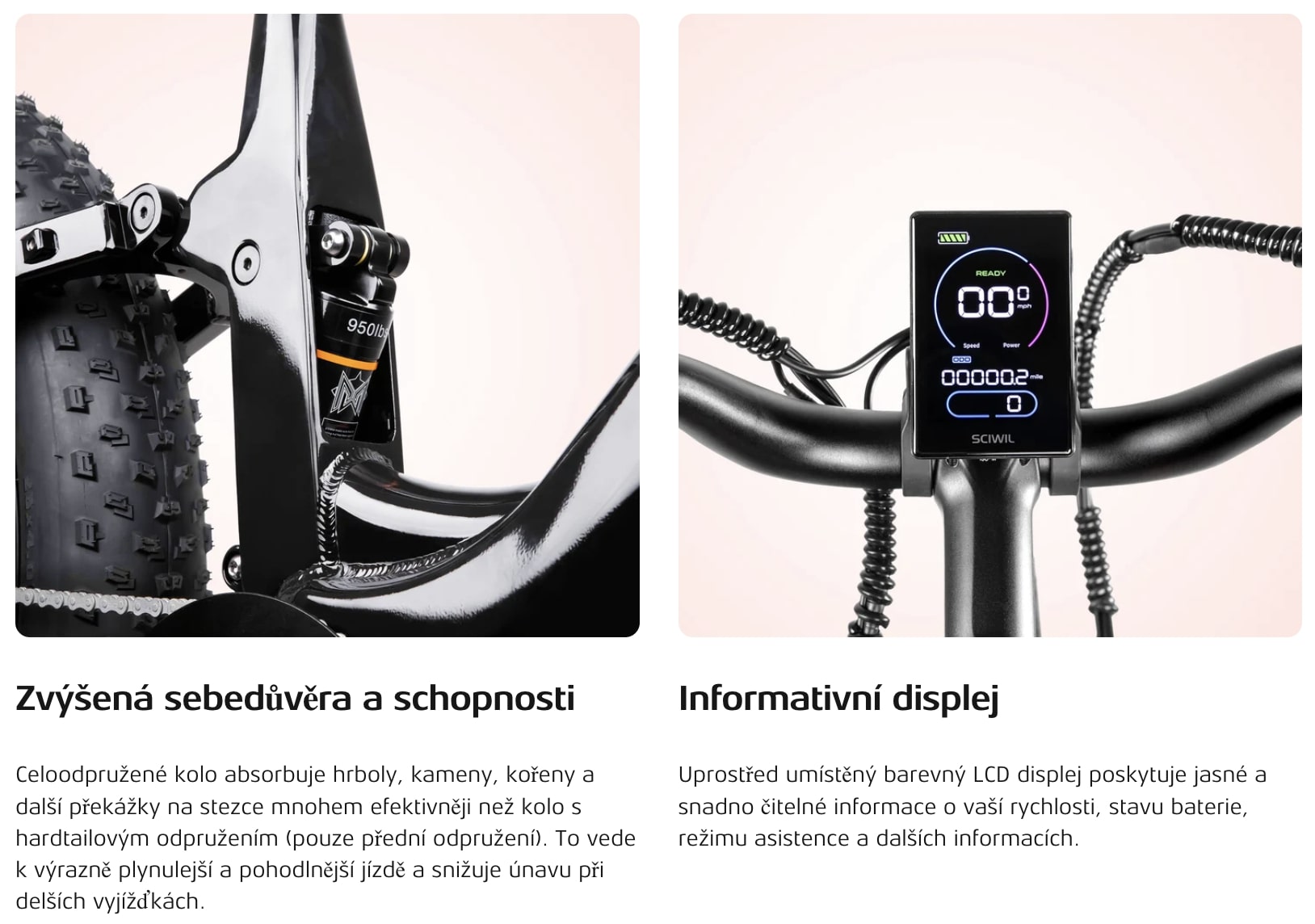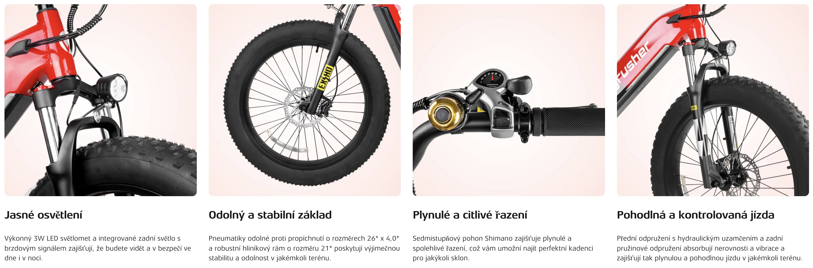 S 26×4,0” plášti typu fat tire, výkonnými hydraulickými kotoučovými brzdami a elegantním hliníkovým rámemnabízí stabilitu, bezpečnost a styl při každé jízdě.