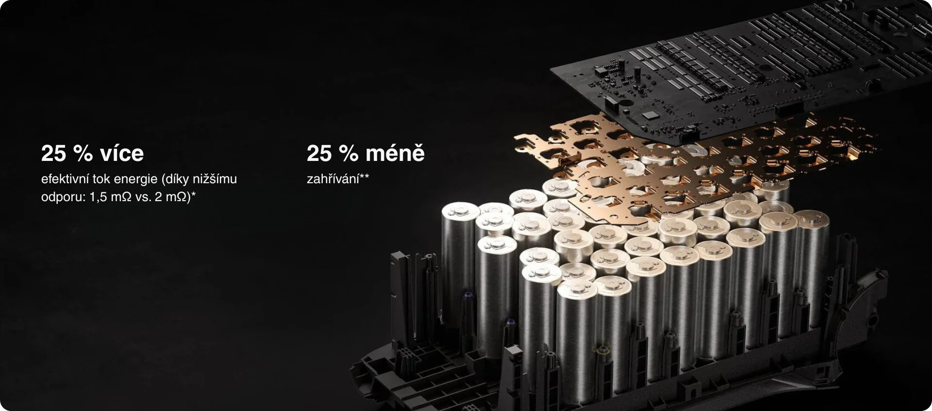 **Vnitřní odpor jednoho článku je snížen o 25 %, což podle vztahu Q = I²Rt znamená, že při stejném proudu vzniká až o 25 % méně tepla.