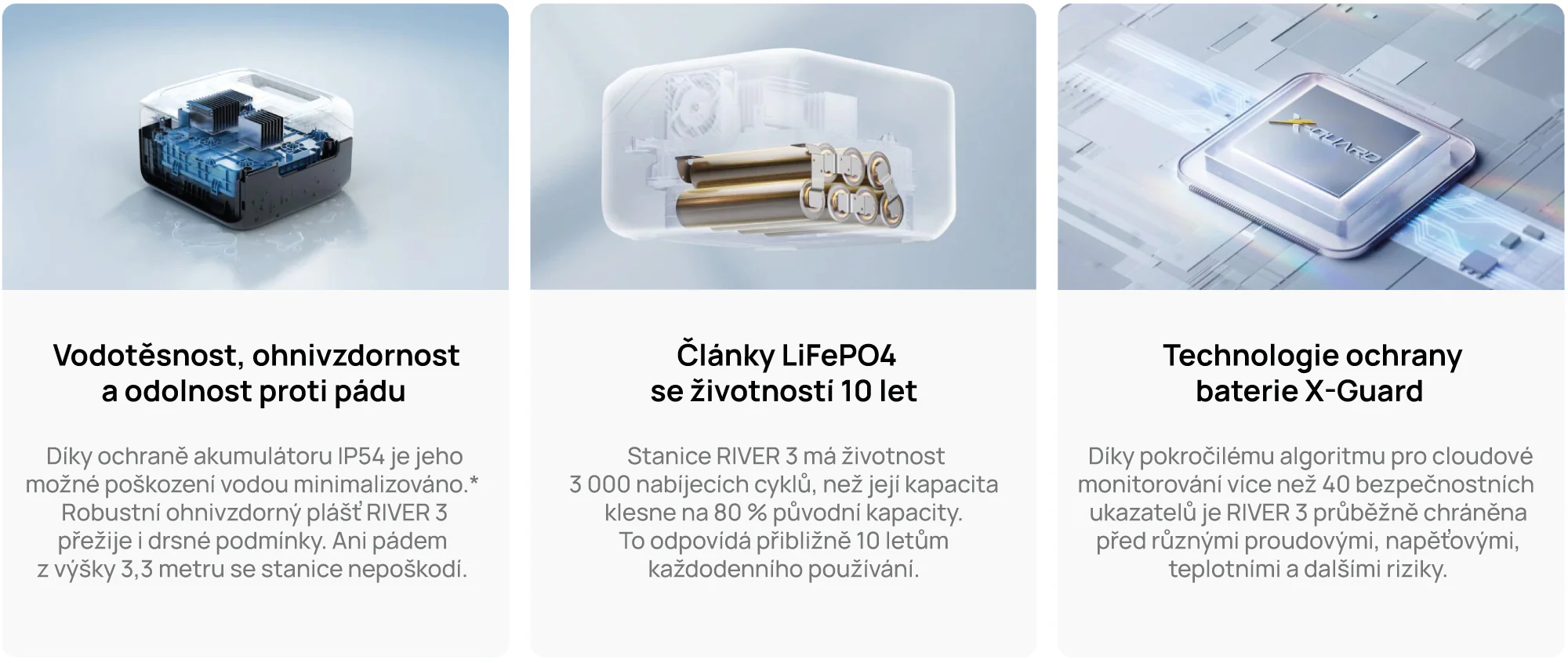 *Stupeň vodotěsnosti IP54 se vztahuje pouze na vnitřní akumulátor, nikoli na celou bateriovou stanici. Neochrání při ponoření do vody, ale může zabránit požáru nebo výbuchu v případě zkratu, když je baterie postříkána vodou nebo zasažena deštěm, čímž je zajištěna bezpečnost uživatele a ochrana majetku.