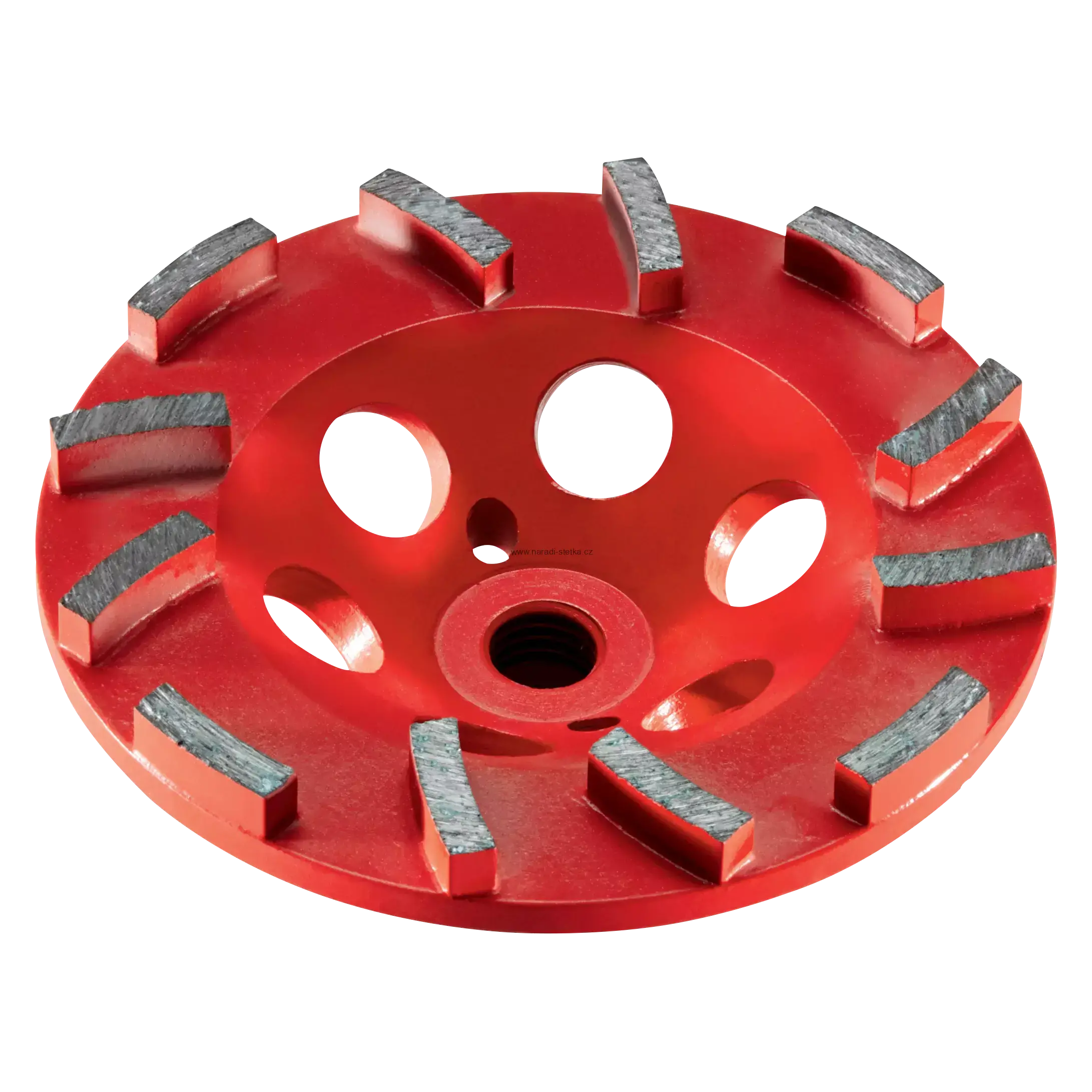 Brusný talíř na abrazivní materiály. Na odstranění přebytků betonu po sejmutí bednění na čerstvě betonovaných plochách, minerálních lepidel, omítek, malt, abrazivního pískovce, vápence, šamotu, asfaltu.