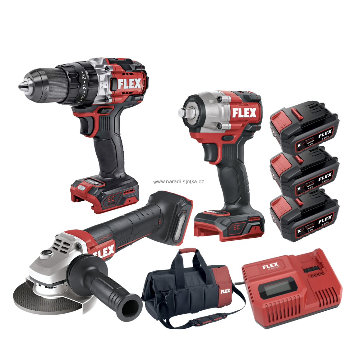 - FLEX PACK Akční Sada Nářadí č.07, Aku šroubovák 158Nm + Rázový utahovák 600Nm + úhlová bruska 125mm s pádlovým spínačem